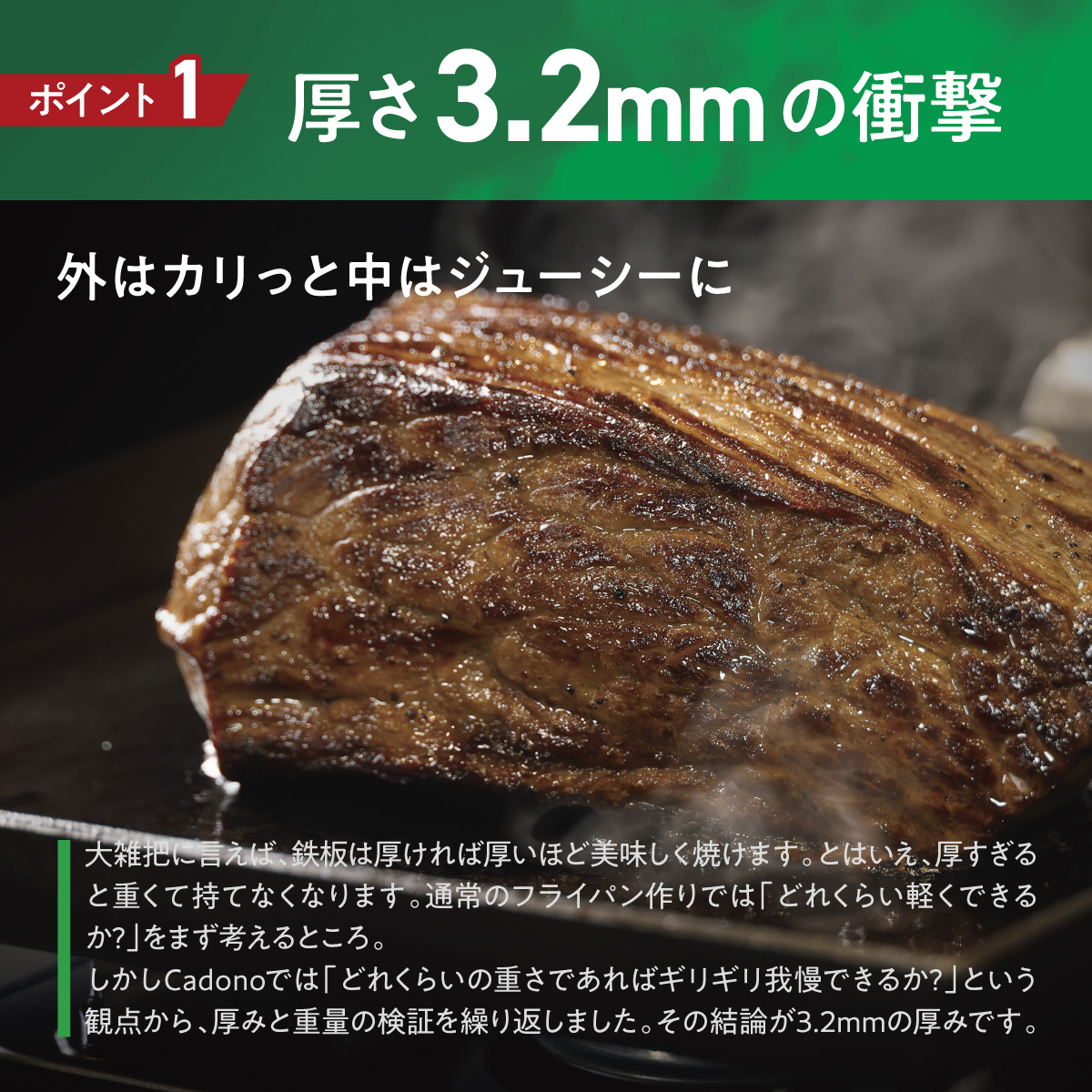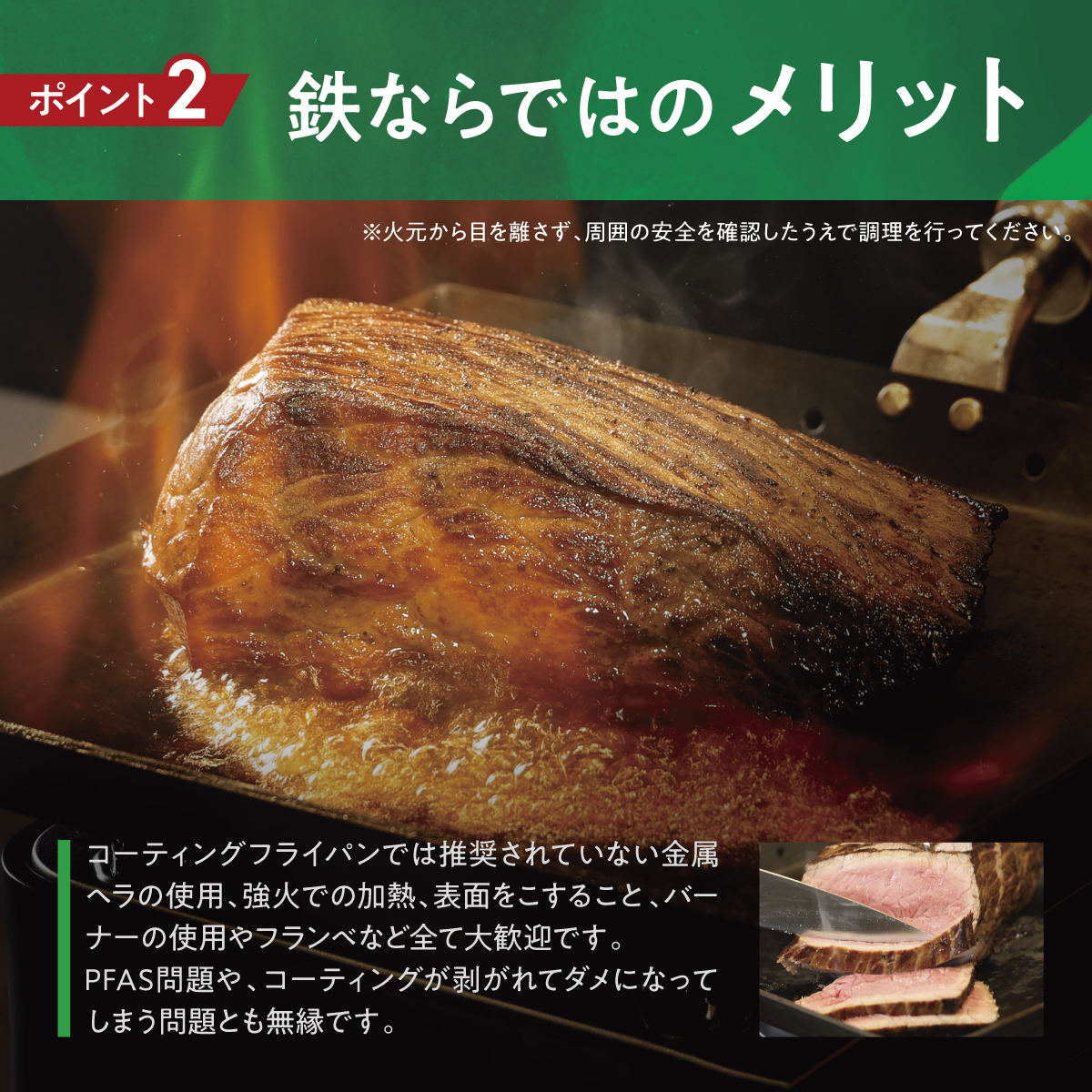 | 注意事項 | シーズニング(油ならし)の仕方 ①洗剤を使用し、よく洗う。 ②キッチンペーパーで油を全体に塗り広げながら加熱する。 ※煙が出やすいので、しっかり換気をしてください。 また、空焼き状態で非常に高温になるので、火傷に注意してください。 取り扱い上のご注意 ●調理中は絶対にそばを離れないでください。 ●空だきはしないでください。火災の原因になります。 ●とても重いので、落下するとけがの恐れがあります。お取扱いの際はご注意ください。 ●揚げ物には使用しないでください。 ●調理に使用するものです。それ以外の用途には使用しないでください。 ●はじめてお使いの際は取っ手のガタツキ等がないか確認してから使用してください。 ●強火での空焚きや長時間の加熱は、製品の変形や表面の損傷、事故につながる原因となりますのでお控えください。 ●自動食器洗浄機や乾燥機でのご使用はおやめください。 ●乳幼児やお子様の手の届かない安全な場所で保管してください。 |